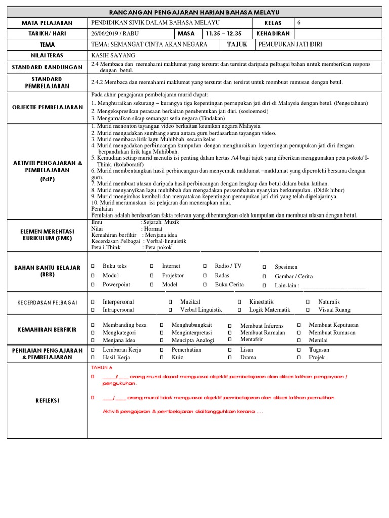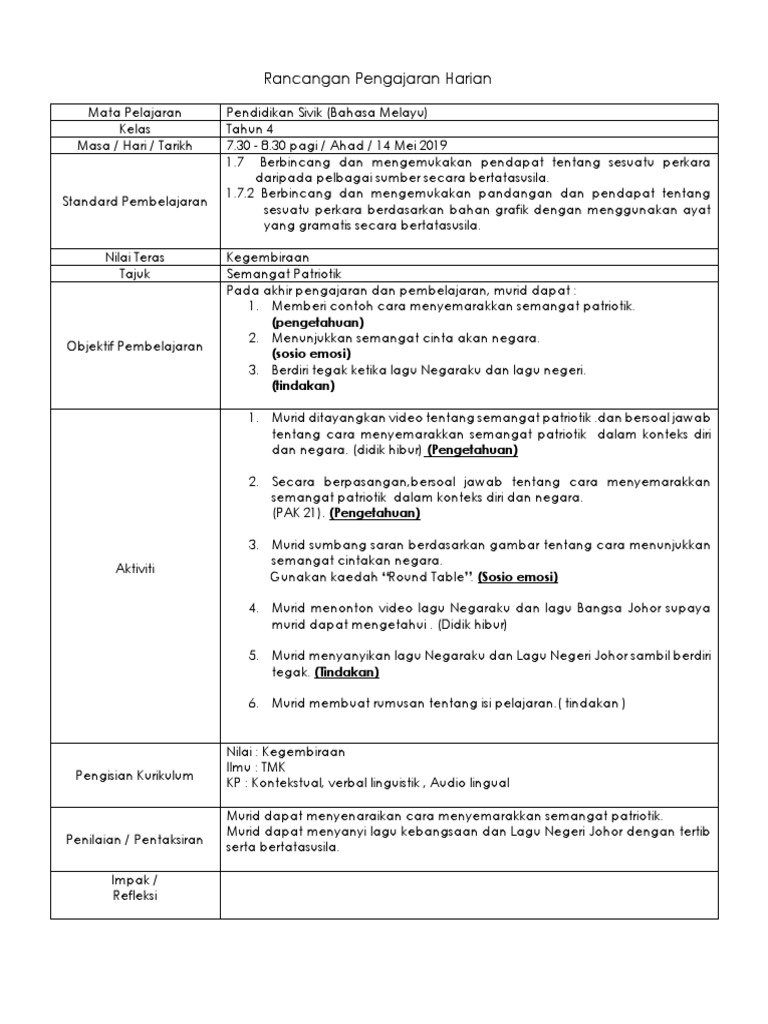 Rancangan Pengajaran Harian Pendidikan Sivik Dalam Bahasa Melayu Tahun 6 Jun 2019 Pdf